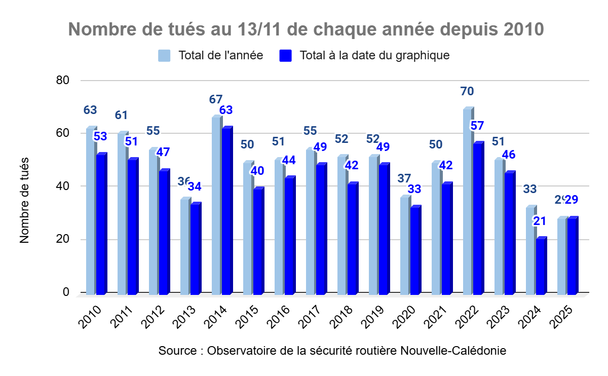 Au 13 novembre 2025, le nombre provisoire de tués sur les routes de Nouvelle-Calédonie est de 29.