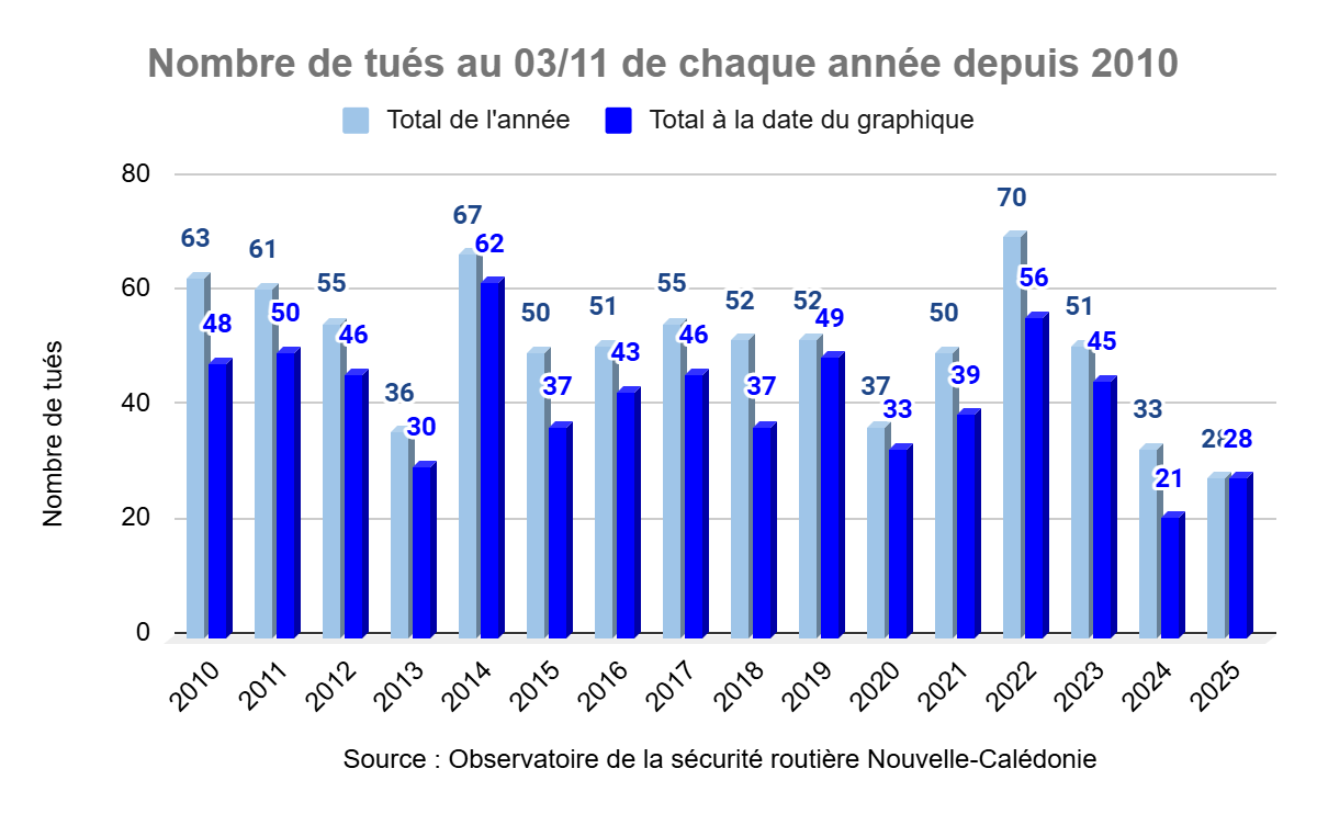 Au 03 novembre 2025, le nombre provisoire de tués sur les routes de Nouvelle-Calédonie est de 28.