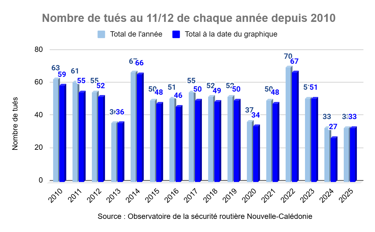 Au 11 décembre 2025, le nombre provisoire de tués sur les routes de Nouvelle-Calédonie est de 33.