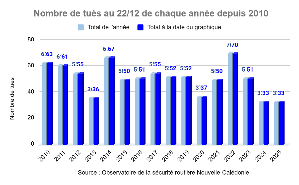 Au 22 décembre 2025, le nombre provisoire de tués sur les routes de Nouvelle-Calédonie est de 33.