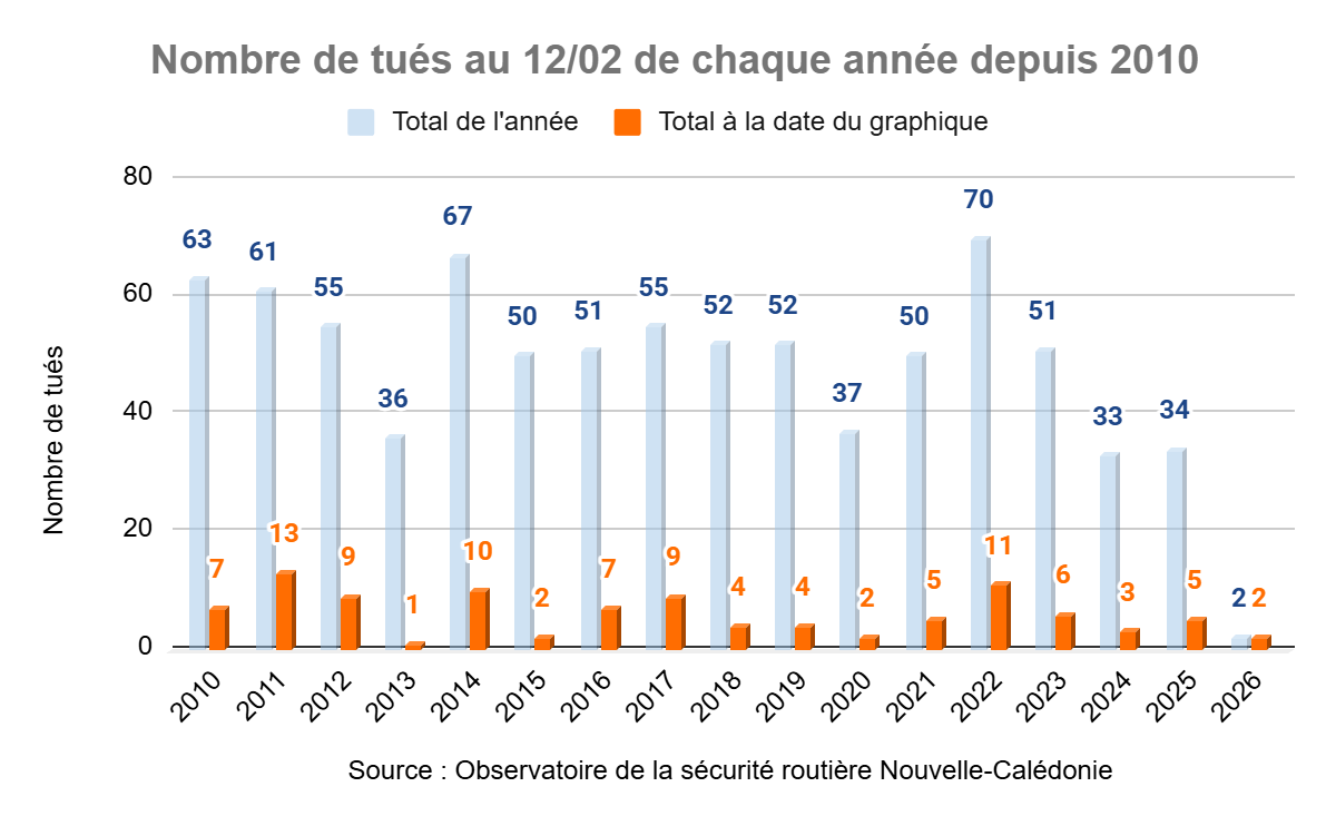 Au 12 février 2026, le nombre provisoire de tués sur les routes de Nouvelle-Calédonie est de 2.