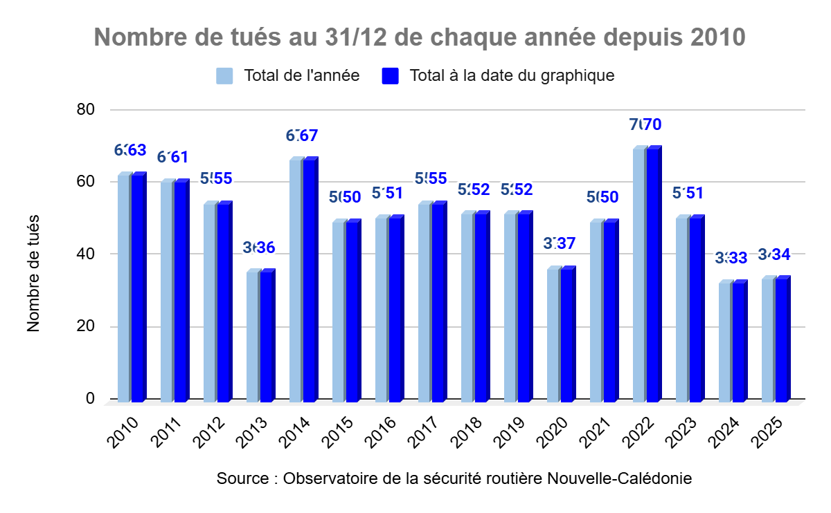 Au 31 décembre 2025, le nombre provisoire de tués sur les routes de Nouvelle-Calédonie est de 34.