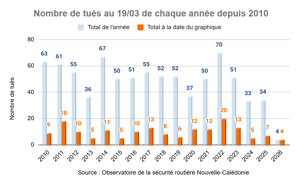 Au 19 mars 2026, le nombre provisoire de tués sur les routes de Nouvelle-Calédonie est de 4.