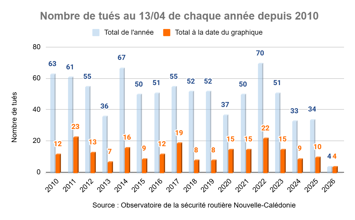 Au 11 mars 2026, le nombre provisoire de tués sur les routes de Nouvelle-Calédonie est de 4.