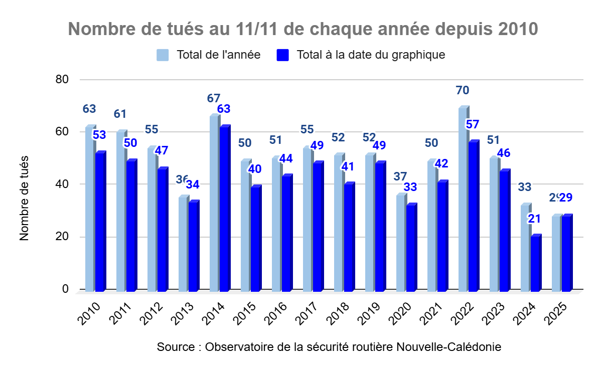 Au 11 novembre 2025, le nombre provisoire de tués sur les routes de Nouvelle-Calédonie est de 29.
